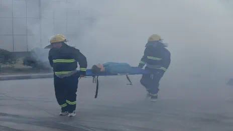 演練模擬公司LOX液氧罐區(qū)泄露,突發(fā)火情,公司應(yīng)急救援隊(duì)緊急集合,迅速攜帶消防器材趕往現(xiàn)場(chǎng)救援。由于事故升級(jí)、火情失控,公司立即啟動(dòng)應(yīng)急預(yù)案,組織員工疏散,并上報(bào)園區(qū),對(duì)接園區(qū)應(yīng)急預(yù)案,調(diào)集社會(huì)消防救援力量,組織搶險(xiǎn)。
